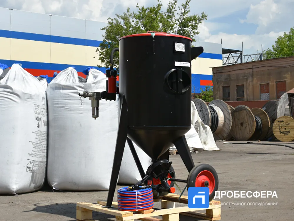 Мобильность агрегату обеспечивает монтаж 200-литровой емкости для абразива на колесной тележке с упором. Даже с полной заправкой абразивом аппарат можно перемещать в пределах рабочей площадки. Наличие фильтра исключает вероятность слеживания абразива и потери частицами необходимых характеристик.