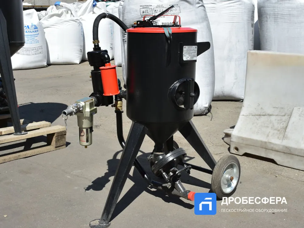 25-литровый бункер для загрузки абразива смонтирован на мобильной тележке. Обеспечивает обработку 4-15 квадратов в зависимости от абразива и давления (3,5-10 бар). Дистанционно включается подача пневмоэнергии и производится стравливание давления из бака по окончании работы.