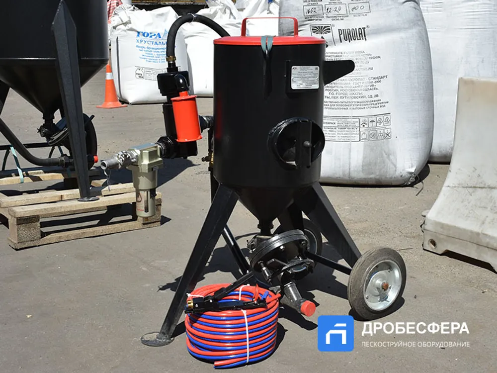 Мобильность агрегата обеспечивает монтаж 25-литровой емкости для абразива на двухколесной тележке с упором. Установка без проблем перемещается в пределах рабочей площадки даже с полной емкостью.