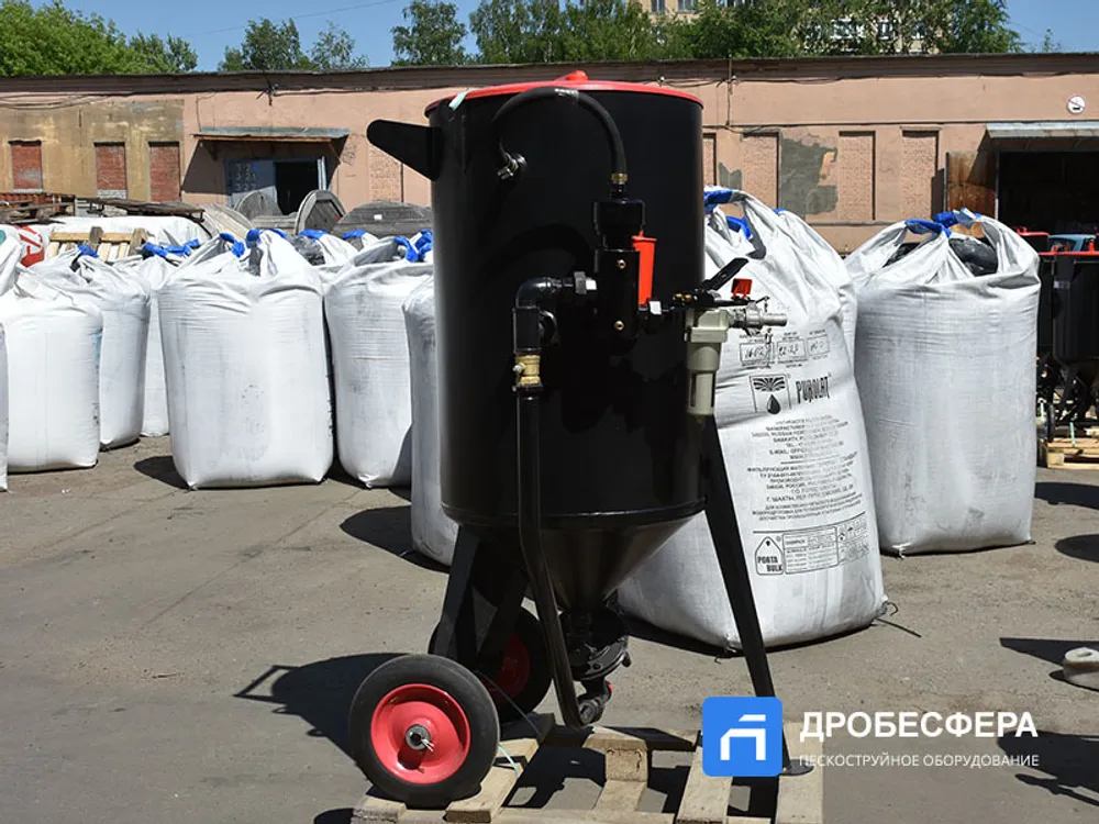 Представляет собой агрегат напорного типа, мобильность которого обеспечивается наличием колесной тележки, служащей базой для монтажа бункера на 250 литров. Наличие фильтра-влагомаслоотделителя обеспечивает сохранность абразива в сухом состоянии и повышает эффективность обработки воздушно-абразивным потоком. Шиберный или универсальный дозатор абразива позволяют регулировать интенсивность воздействия на поверхности.