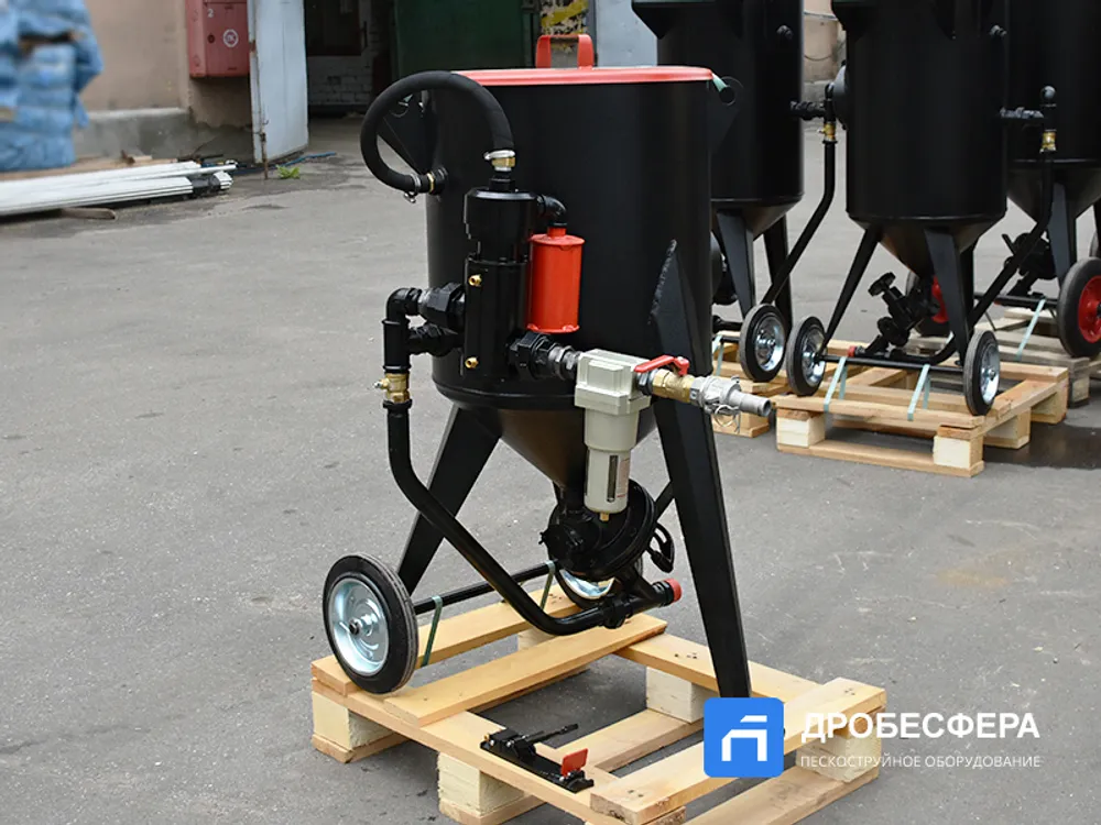 Помимо «бочки» для загрузки 75 литров абразива, имеет фильтр-влагомаслоотделитель, устанавливаемый на входе сжатого воздуха перед бункером. Фильтр обеспечивает сохранение абразива сухим, что обусловливает высокую эффективность обработки. Наличие пневматического клапана ДУ обеспечивает возможность управления аппаратом в одиночку.