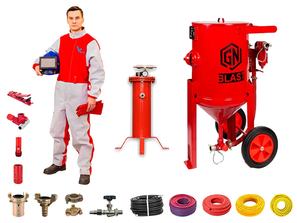 В комплекте, помимо все рукавов, фитингов, дистанционного управления, профессионального дозатора абразива и прочего, включен и полноценный комплект защиты оператора профессионального уровня, подходящий для работы не только купершлаком и кварцем, но и стальной и чугунной дробью.