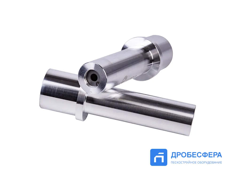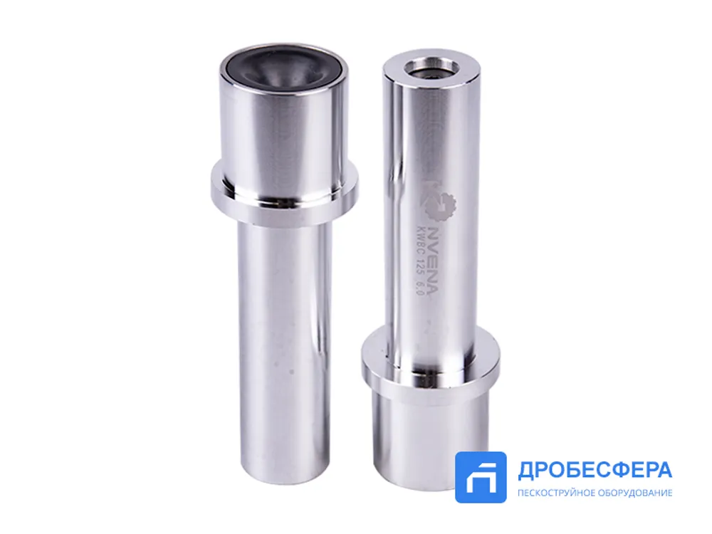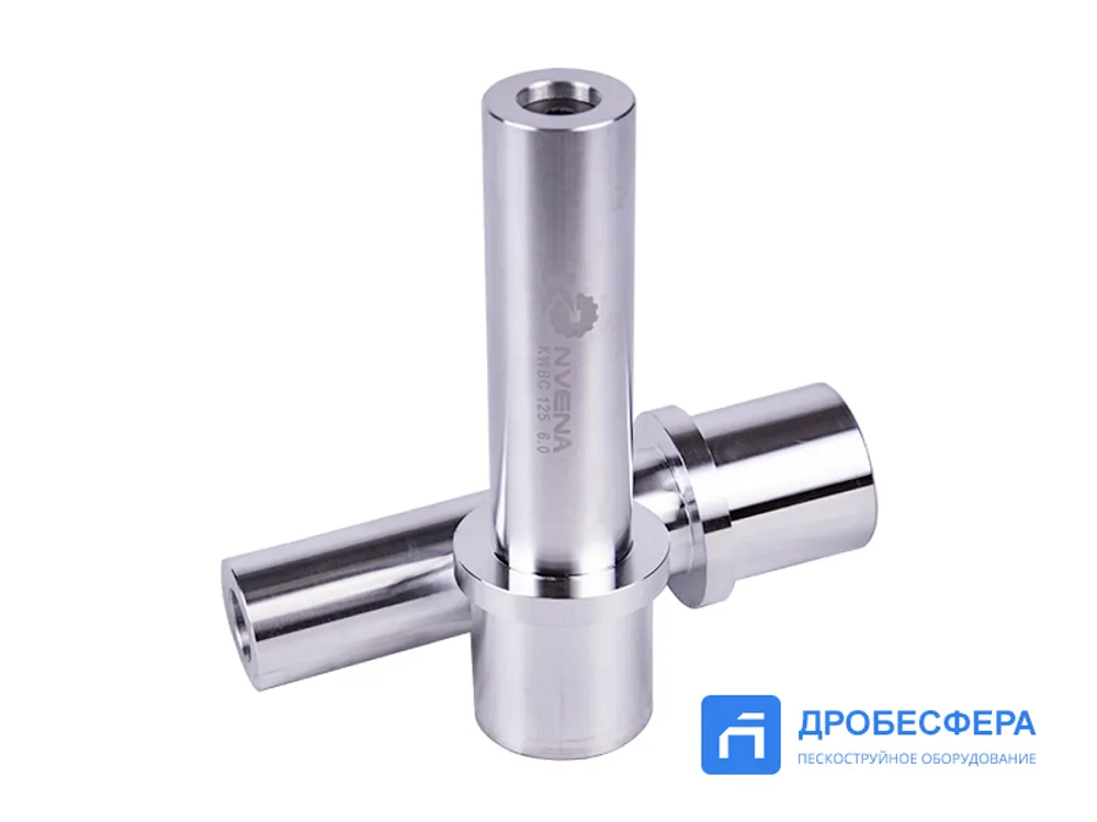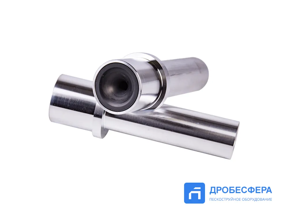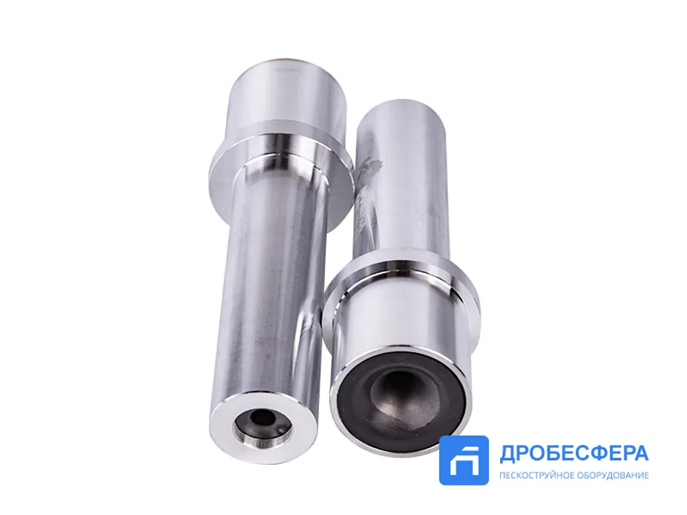 По своему строению такое сопло не отличается от составляющих его компонентов: корпус выполнен из алюминия, а внутренняя вставка сопла из карбида бора выполняет функцию протектора, защищая корпус от разрушения под ударами абразивных частиц.