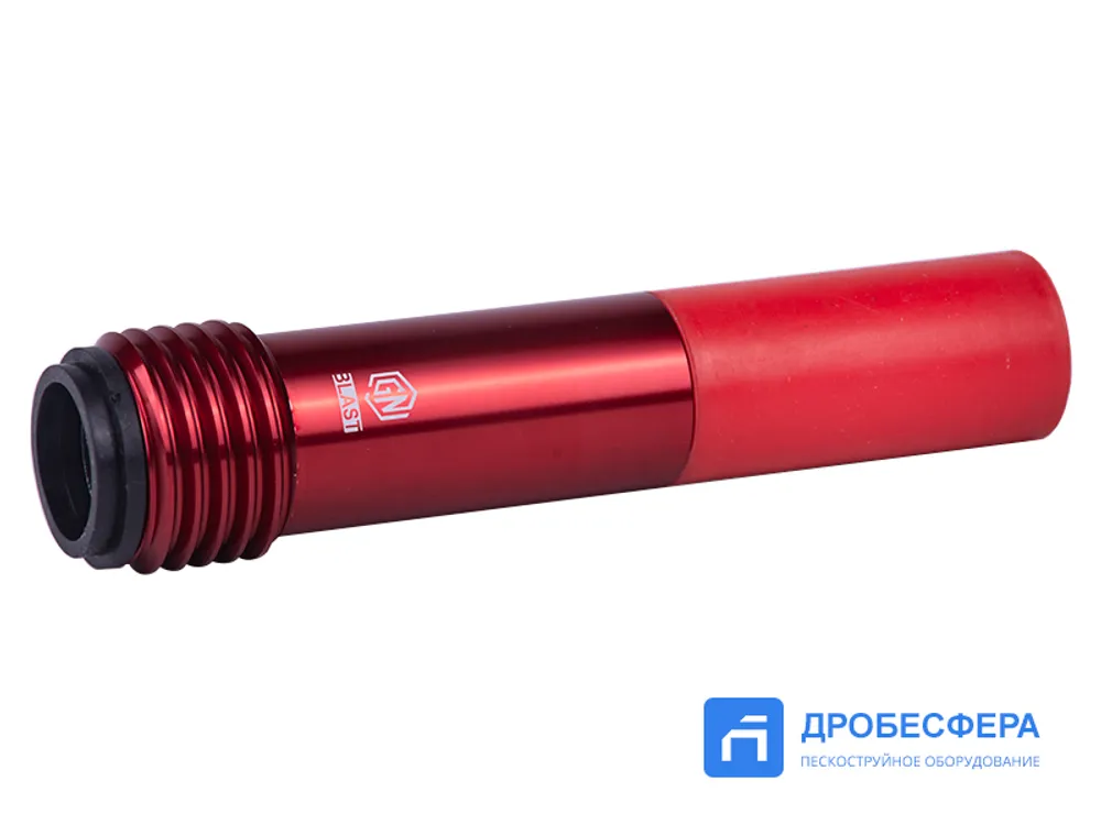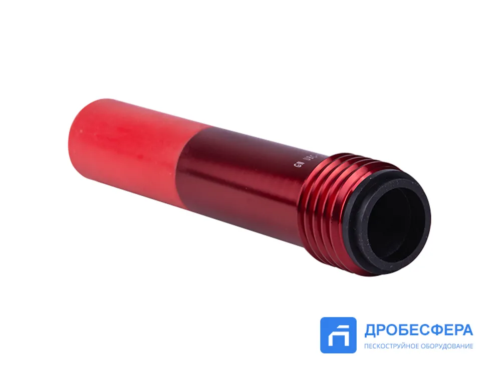 Сопло длиной 210 мм изготавливается из карбида бора, что и позволяет работать с абразивными составами из материалов высокой степени твердости. Алюминиевая оболочка защищает компонент от воздействия внешних факторов. Сопло выдерживает до 1000 часов непрерывной эксплуатации пескоструя.