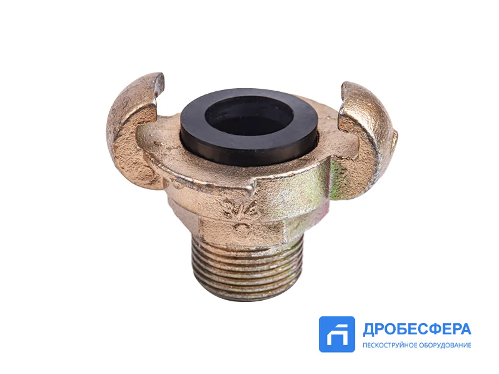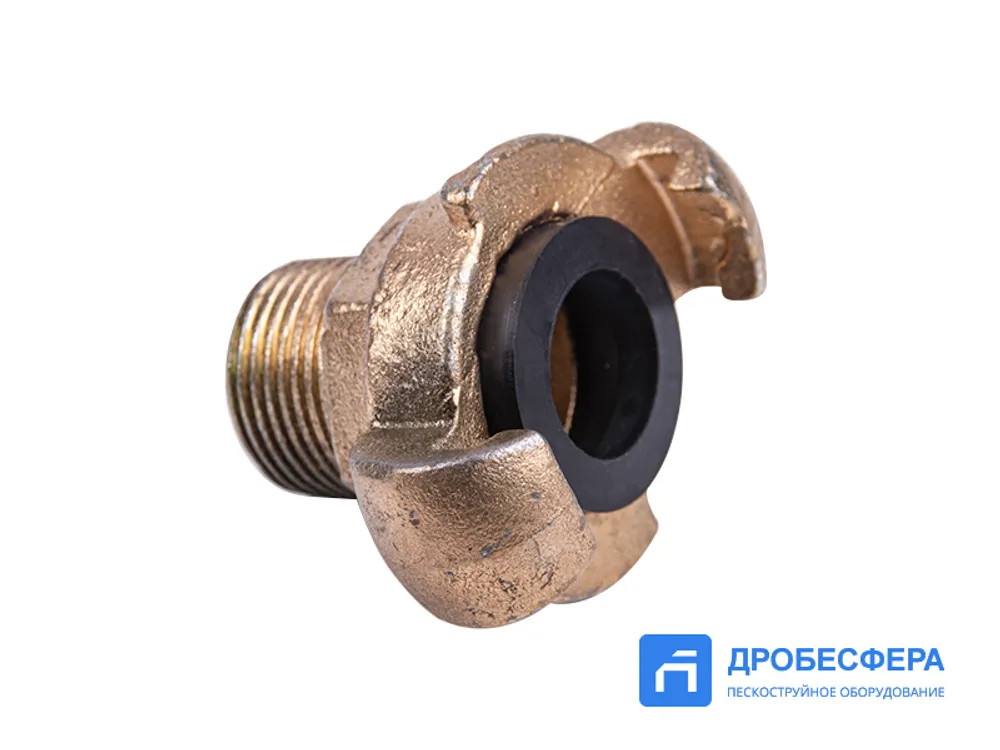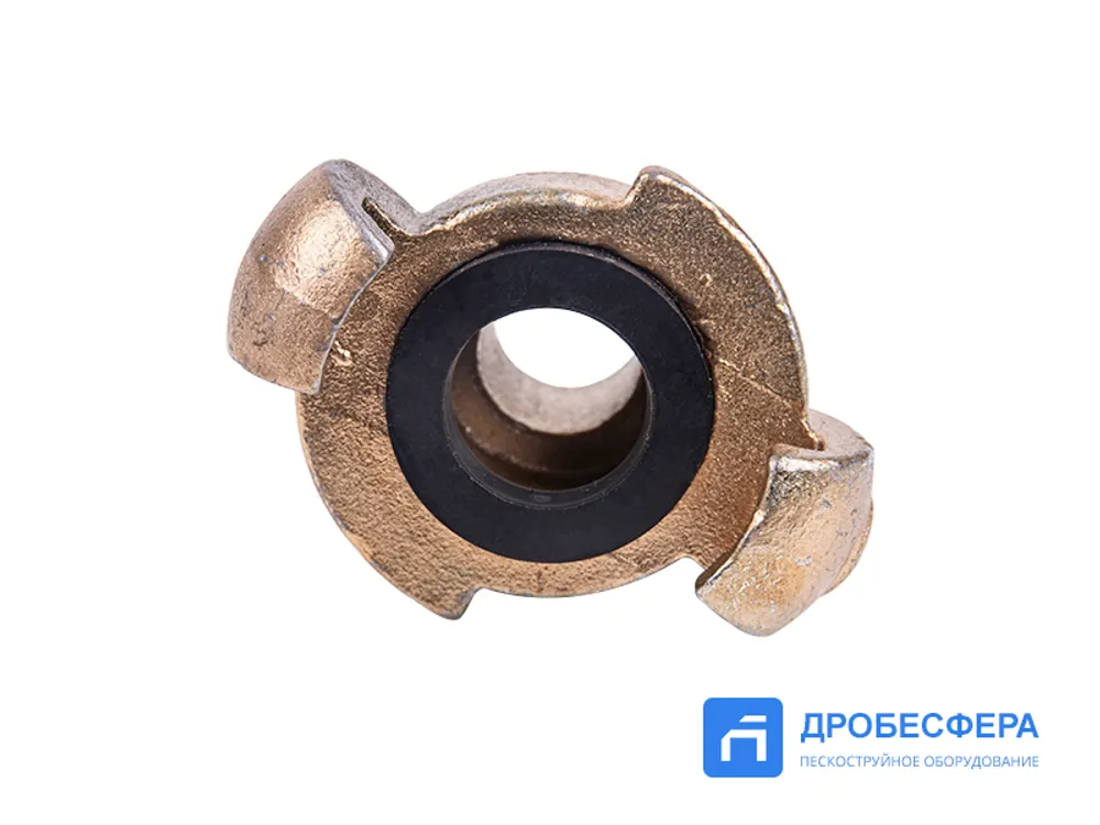 Металлическое соединение с гальваническим защитным покрытием обеспечивает надежное примыкание рукава к выходу пневмонагнетателя и абразивоструйного аппарата. В местах крепления исключается утечка сжатого воздуха, что не позволяет давлению падать. Использовать сцепление необходимо в паре с подобным крепежом.
