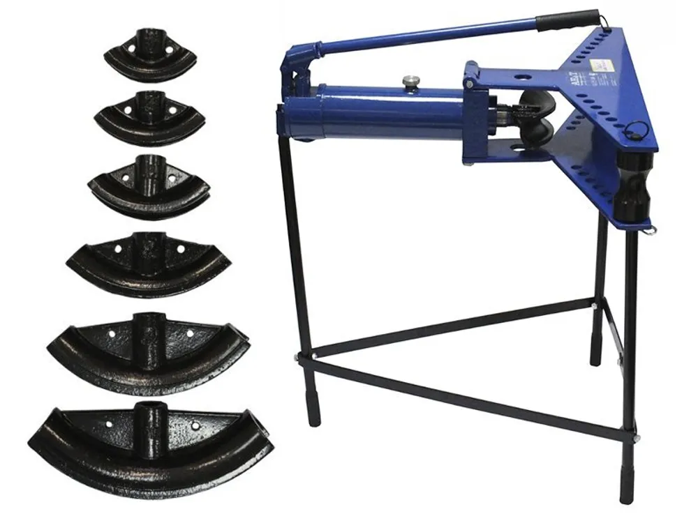 При необходимости манипуляций с металлическими трубами и прутами диаметром 1/2”, 3/4”, 1”, 1-1/4”, 1-1/2”, 2”, предлагаем использовать гидравлический трубогиб AE&T T60012h китайского производства на подставке. Это повышает комфортность эксплуатации устройства и обеспечивает быстрое изменение конфигурации сортамента для решения производственных или строительных задач.