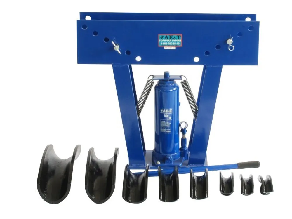 Одно из простейших и очень удобных устройств для сгибания труб и круглого сортамента диаметром 1/2”, 3/4”, 1”, 1-1/4”, 1-1/2”, 2”, 2-1/2”, 3” – китайский гидравлический трубогиб AE&T T60016. Его конструкция предусматривает возможность использования в любом месте, поскольку устройство можно транспортировать с помощью тележки (вес трубогиба достигает 57 кг). Наличие в комплекте упоров и пуансонов для разных диаметров облегчает эксплуатацию.
