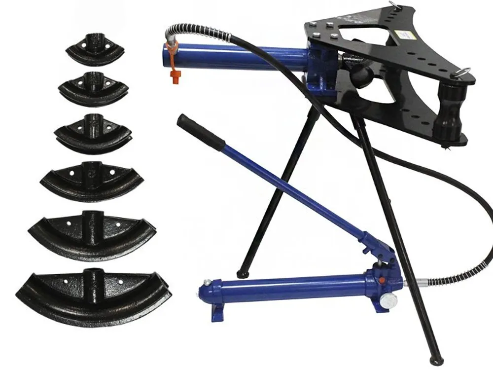 Сгибание труб разного диаметра, арматуры, прута и другой прокатной продукции круглого сечения на требуемый угол может выполняться с применением таких устройств как китайский гидравлический трубогиб AE&T T60016p. Это компактная конструкция на треноге в виде опоры, комплектующееся выносным гидравлическим насосом с возможностью качания рукой или ногой.