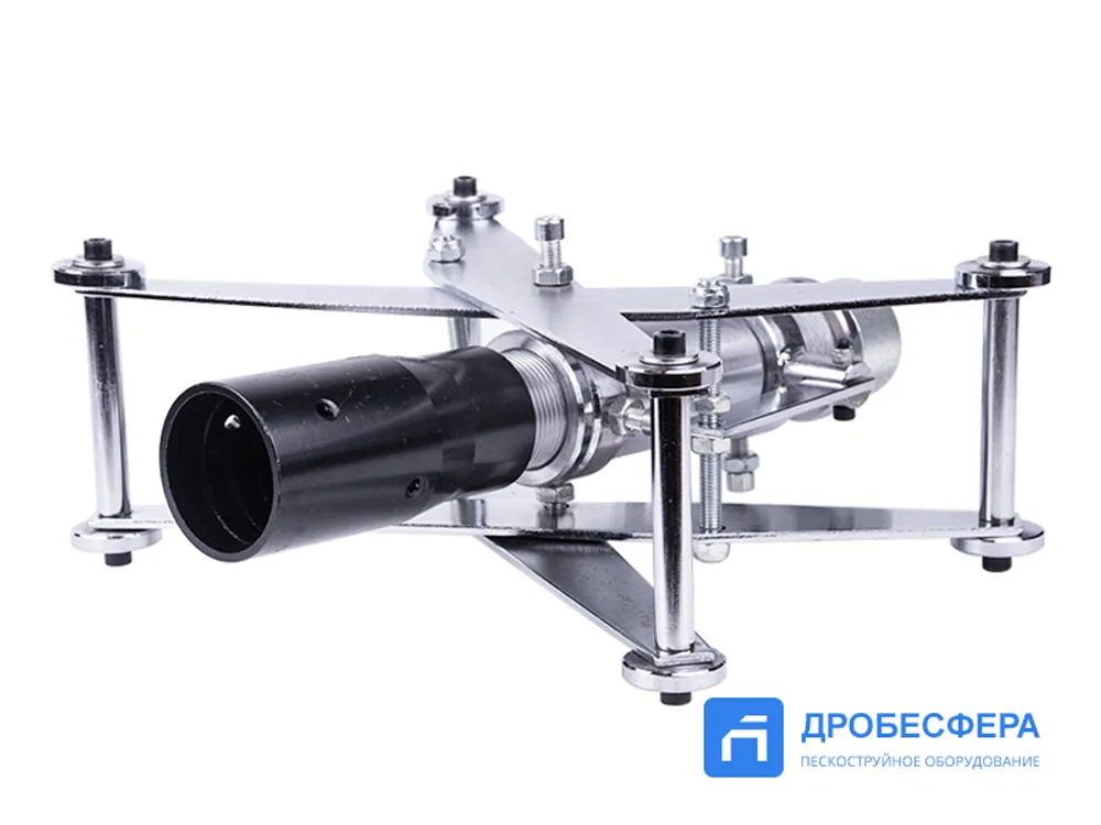Устройство устанавливается на абразивоструйный рукав диаметром 32 мм и обеспечивает эффективный процесс кольцевой подачи абразивно-воздушного потока на внутреннюю поверхность трубы при протягивании сквозь нее. Одновременная работа абразива по всему диаметру обеспечивает равномерное воздействие частиц при зачистке труб, освобождении от наслоений природного и технологического характера.