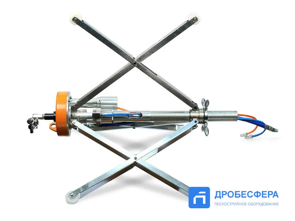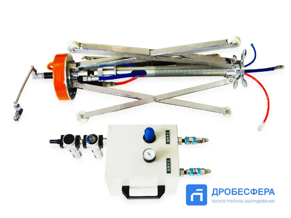 Это специальная конструкция, обеспечивающая равномерное распыление окрашивающей смеси при продвижении внутри трубы. Представляет собой разработку для подачи наносимого состава давлением 4-6 бар из емкости. Распыление осуществляется специальной форсункой.